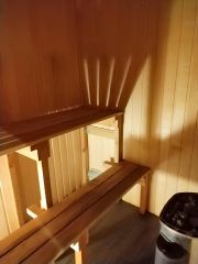 Сауна электрическая, автоматическое регулирование температуры, вениками пользоваться запрещено, стоимость 3000 р. в сутки. При заказе сауны от 2 суток - скидки.