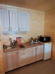 В кухне гостиной находится кухонная мебель, холодильник, микроволновая печь, две электрические плитки, мойка, . Вся посуда имеется и входит в стоимость аренды. Также в кухне гостиной находятся диван ( одеяла, подушек и постельного белья для него нет) , обеденный стол 90*120 см, 2 стула, телевизор 24 дюйма ( 20 каналов).