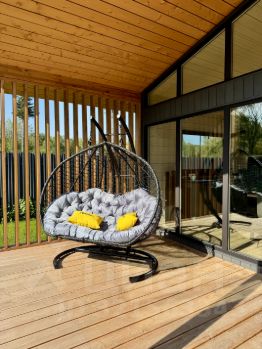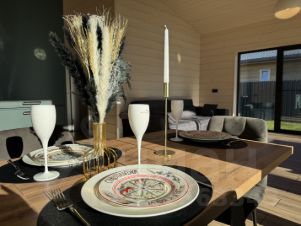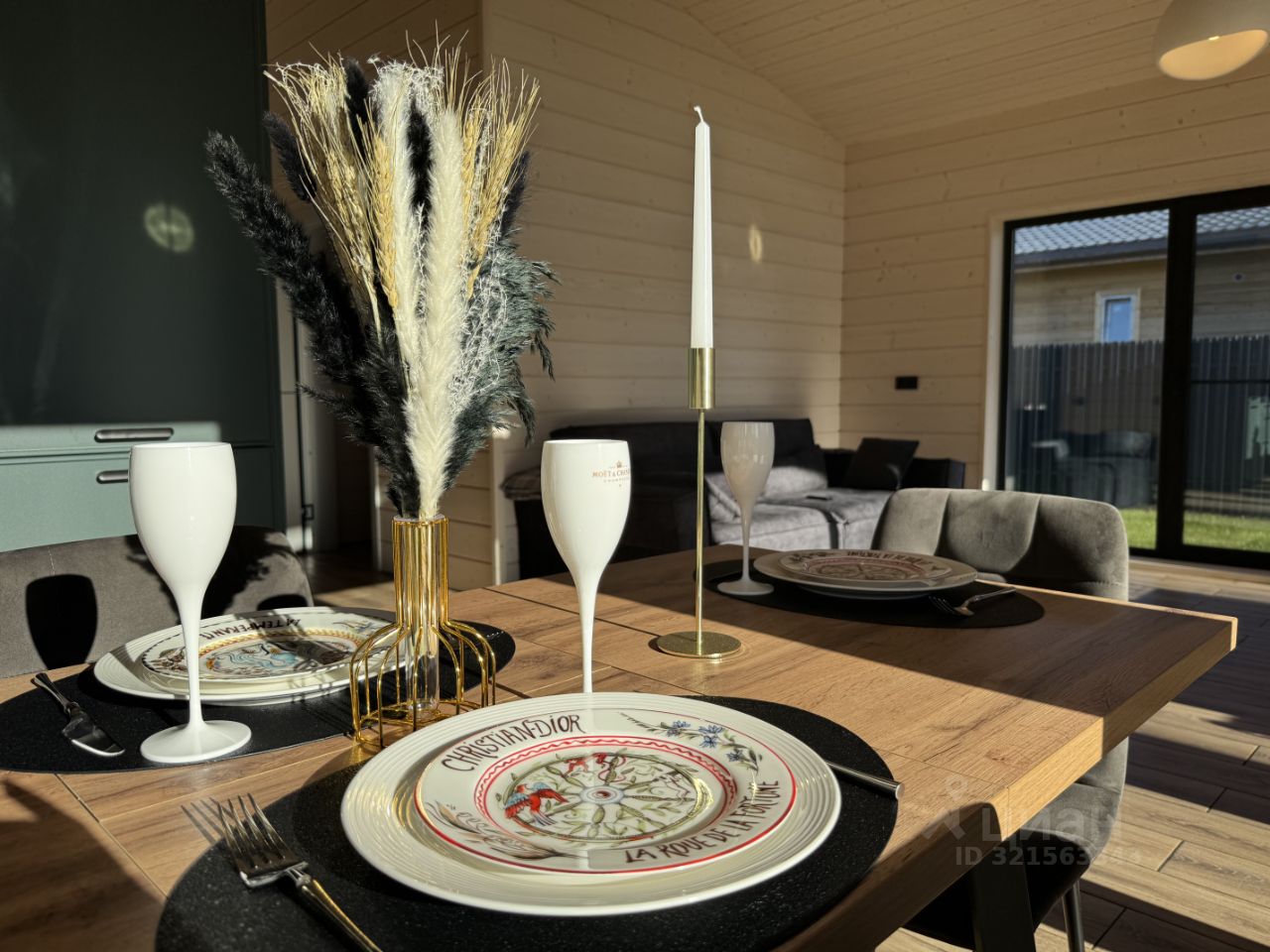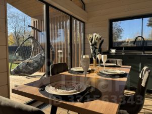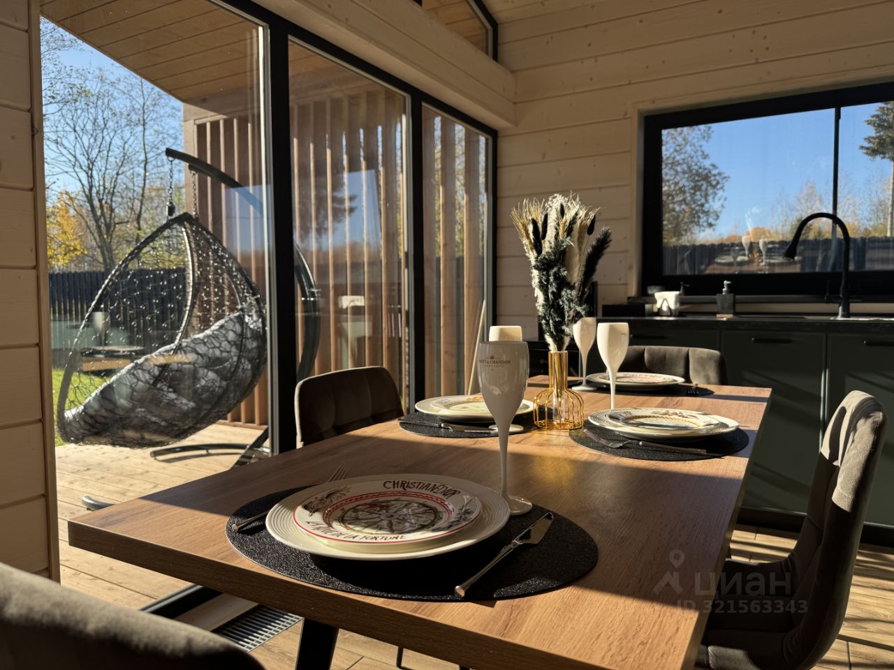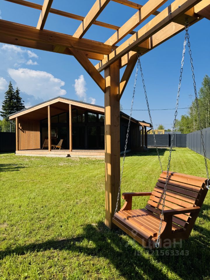 В доме: две спальни с кроватями 160*200, просторная кухня-гостиная с диваном, ванная комната, сауна, терраса 24 кв.м, мангальная зона, качель, костровая чаша, парковочное место