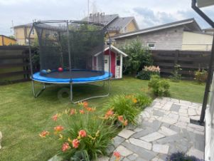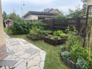 По вечерам уютно отдыхать на большой террасе. На участке много плодовых кустов: смородина, крыжовник, малина, предусмотрено место для высадки клубники, стеклянный парник. Также есть вместительный хозяйственный домик для хранения нинвентаря и инструментов, санок, велосипедов, шин и прочего. Для детей есть большой батут и детский игровой домик.