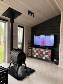 - Гостиная с **дровяным камином**, диваном и ТВ