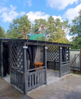 Во дворе большой крытый мангал, шампура, решётка бесплатно. Зона отдыха с деревянными креслами. Навес с летней мебелью. Парковка для 2 машин. Из дома выход на большую крытую террасу, с летней мебелью, защищённую от ветра и дождя.
