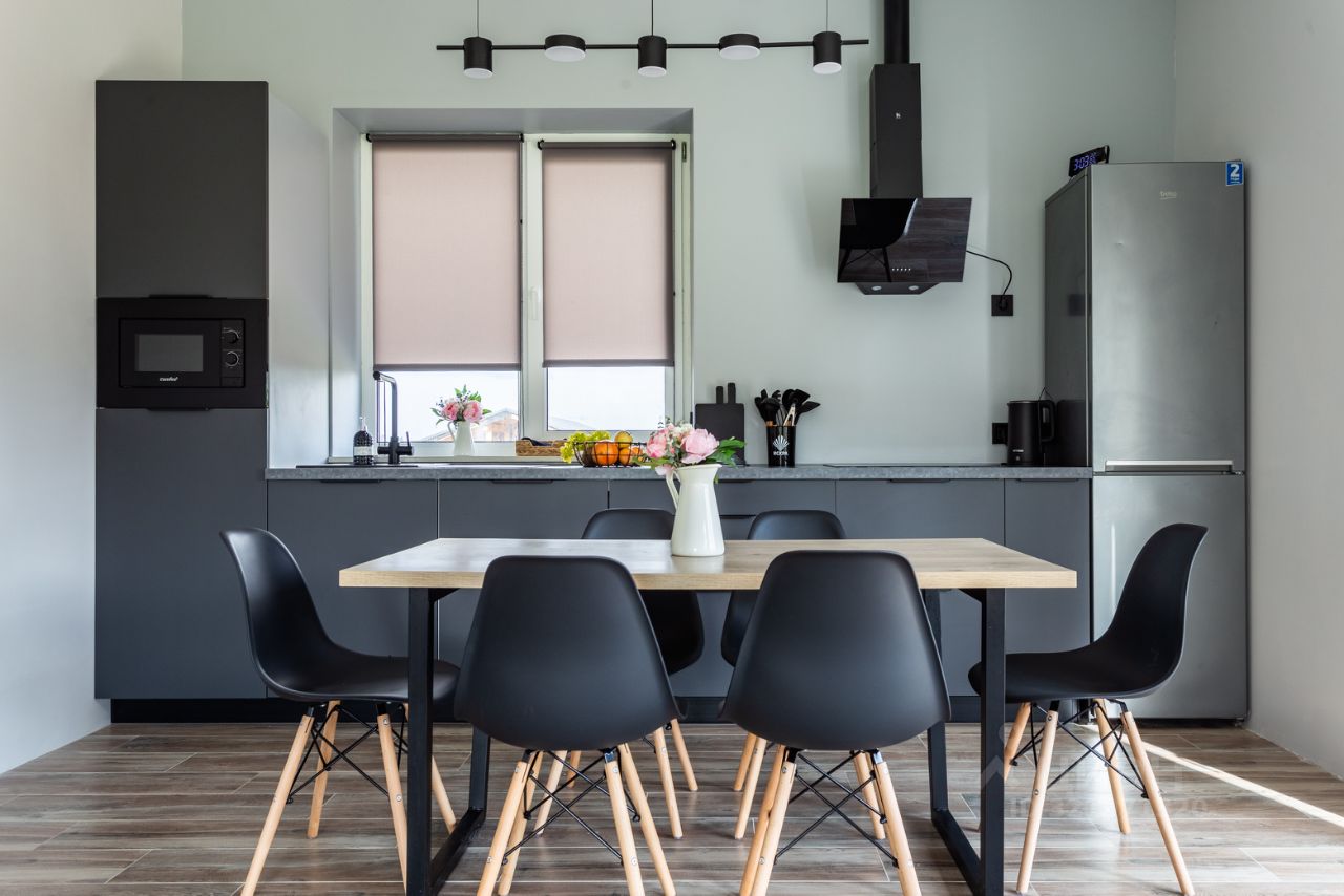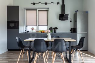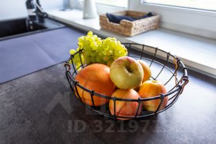 Кухня со всем необходимым (холодильник, варочная панель, микроволновая печь, посудомоечная машина, чайник, посуда и приборы )
