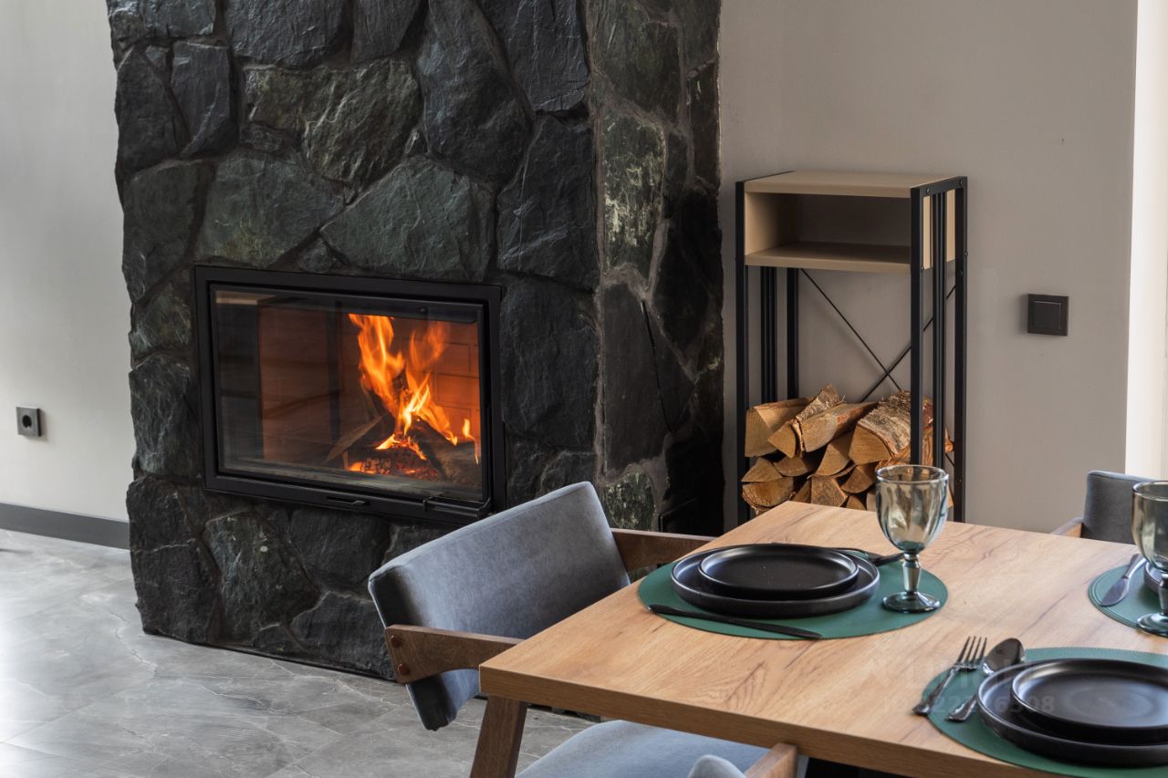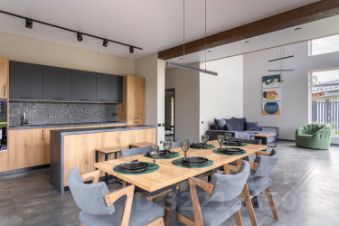 — Кухня-столоая- гостиная с дровяным камином 42 м с выходом на террасу 22 метра