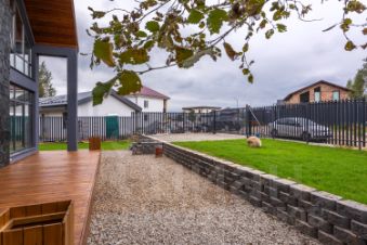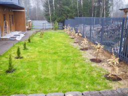 Участок 11 соток огорожен забором с парковой на 2-3 машины, ландшафтным дизайном, крупными соснами и елями на заднем дворе.