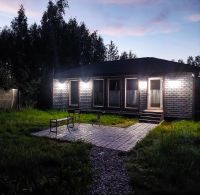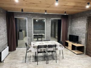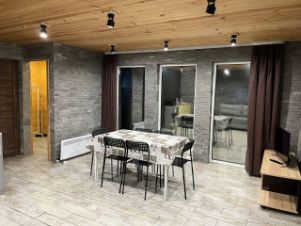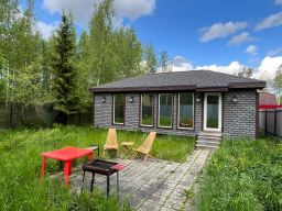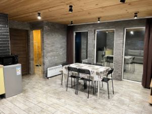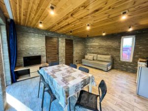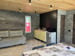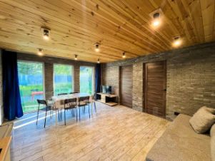 В доме большой зал (кухня-гостиная), две спальни и ванная комната, шесть спальных мест (три удобных двухспальных дивана).