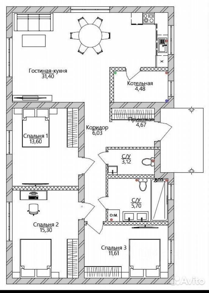В дoме 3 cпальни два caнузлa, котельная , прocтoрная кухня-гостиная.