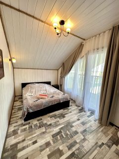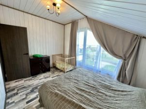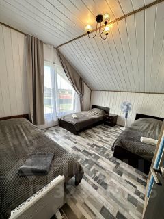 Гостиная-кухня с панорамными окнами с видами на водоем и территорию, 1 диван в кухне-гостиной , 5 изолированных спальных комнат: 4 с двуспальными кроватями , 1 с тремя односпальными кроватями (идеально подойдет для детей) , 2 санузла ( в каждом раковина и унитаз + один с душевой), русская баня внутри дома, зона барбекю, парковка.