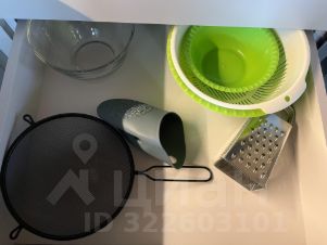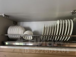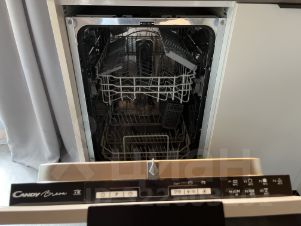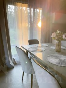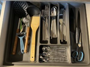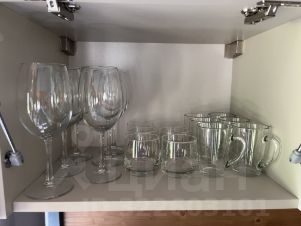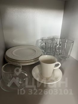 Полноценный двухкамерный холодильник, большая обеденная зона с мягкими стульями, красивая посуда на 6 человек.