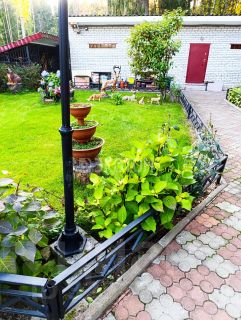 Огорожен металлическим забором, отдельный въезд. Газон, дорожки, цветы,плодовые деревья,
