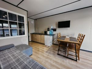 Комфортный и тёплый домик на воде с панорамным видом из кухни-гостиной и отдельной спальни. Вмещает в себя 4 человека (кровать king-size в спальне и угловой диван-кровать в гостиной). В коттежде имеется: мини-кухня с длинной рабочей зоной, чайник, микроволновка, холодильник, посуда и приборы для четверых, SMART-TV, интернет (Wi-Fi). Ванная комната с душевой кабинкой. На улице мангал.