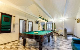 В домике 200 м: (на фото) на первом этаже: -спальня-гостиная с плазменным телевизором, магнитола, караоке-микрофон, камином и раскладным диваном;; -кухня-столовая со столом на 14 человек, посудой и столовыми приборами на 14 персон, большим двух камерным холодильником, газовой плитой с духовкой, микроволновой печью; - отопление первого этажа- везде теплые полы; На втором этаже: -две отдельные спальни с большими двухспальными кроватями; - бильярдная сновым большим русским бильярдным столом (плита камень) и тремя раскладными двуспальными диванами; -эркер с уголком отдыха и двумя двуспальными диванами. Имеется детская кроватка. В стоимости посуда, столовые приборы, постельное белье, банные полотенца, тапочки, мангал, шампура. На участке возле домика 200 метров большая летняя беседка вместимостью до 20 человек. Большой мангал, шампура.