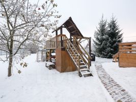 Большой, облагороженный участок с различными детскими зонами развлечений и активностей. Тихое расположение дома.