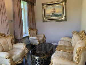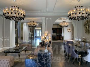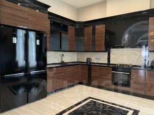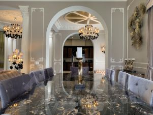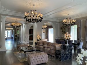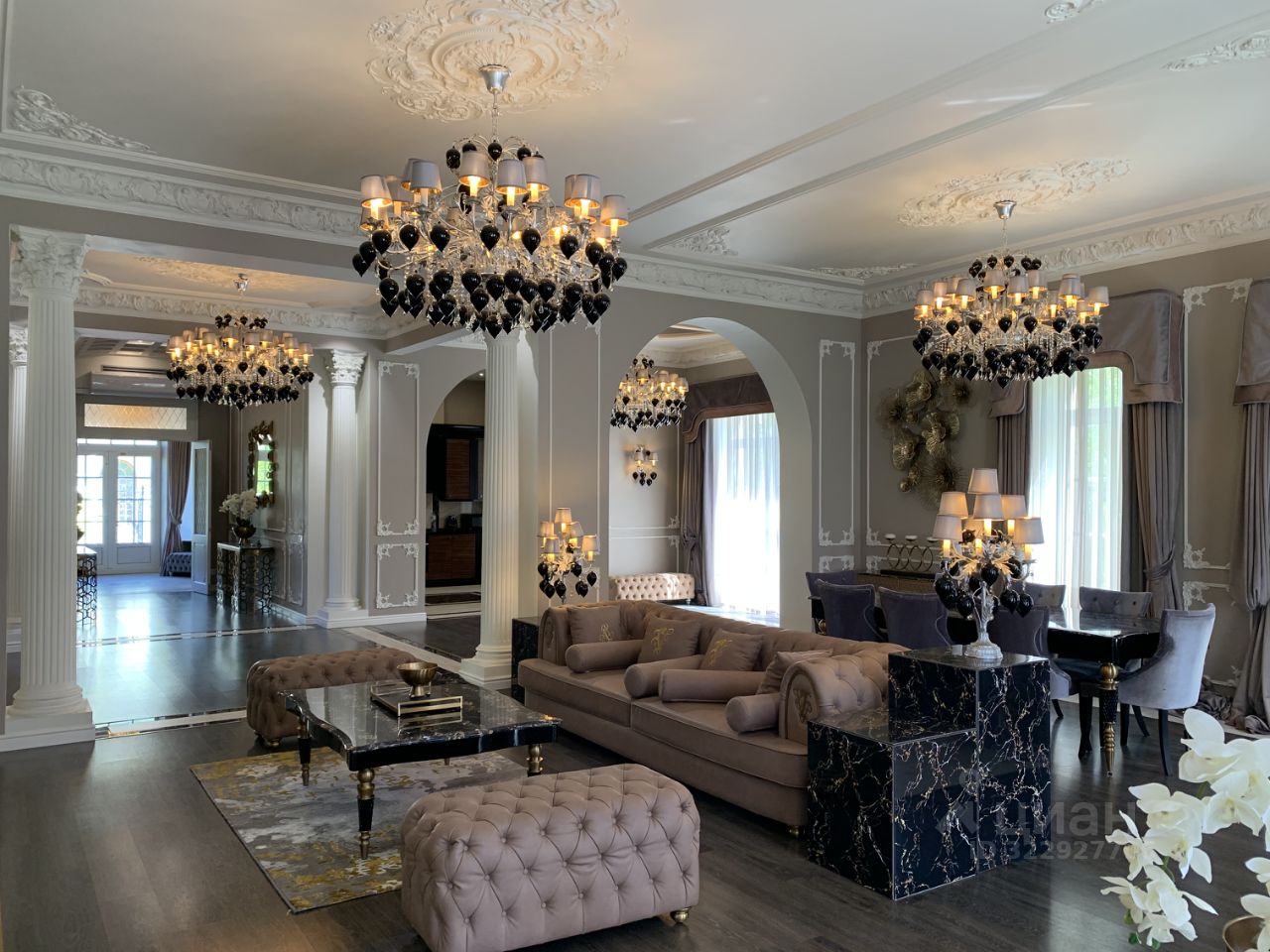- Первый этаж объединяет столовую, гостиную и кухню с роскошной лепкой и мебелью. Кухня оснащена современной техникой, включая два холодильника Samsung и кофемашину Nespresso.