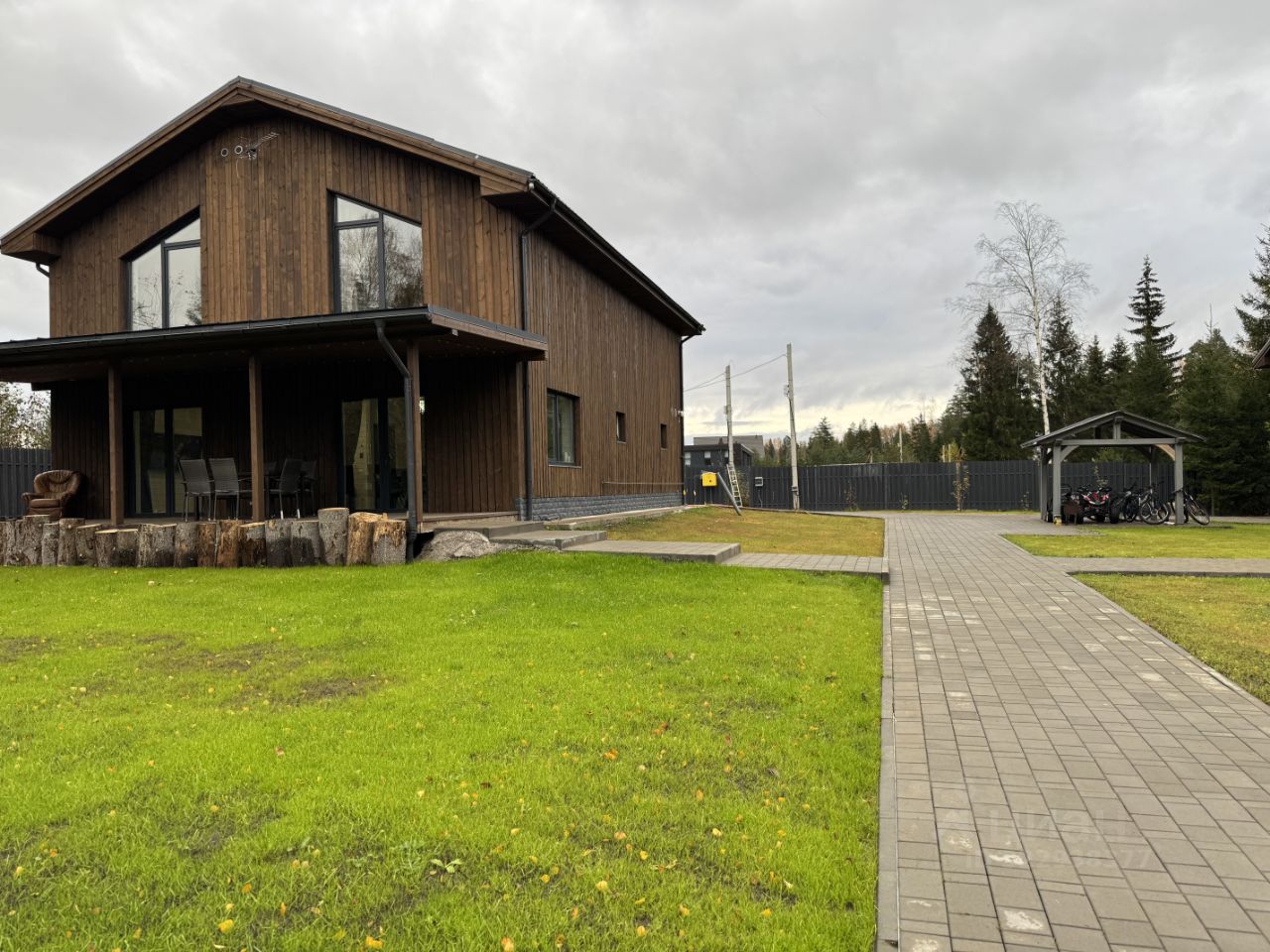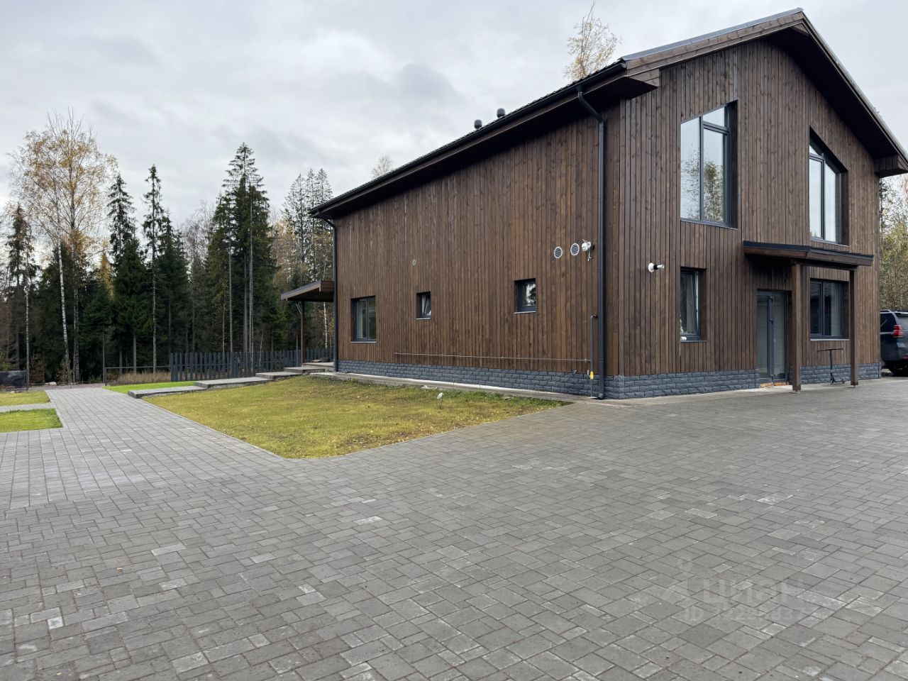 Общая площадь дома 240 кв.метров, который расположен на участке 35 соток на берегу реки Охта. Участок имеет собственную живописную лесную зону и большую территорию.