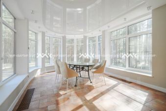 - Светлая столовая с панорамными окнами — вид на озеро и лес с любого ракурса
