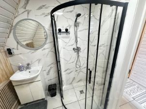 * Современная ванная комната: душевая кабина с тёплой водой, большое зеркало и мягкие полотенца.