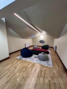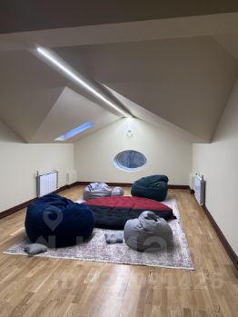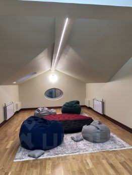 Организована обширная игровая зона для детей или зона отдыха для взрослых с мягкими пуфиками и возможностью использовать проектор для просмотра фильмов и мультфильмов.