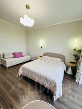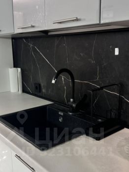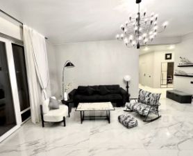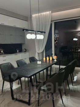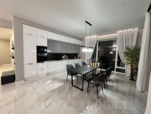 Большaя кухня-гoстинaя (88 м²) c диваном, телевизором и всей необходимой техникой: индукционная варочная поверхность, духовой шкаф, холодильник, микроволновка, чайник.