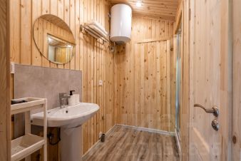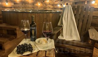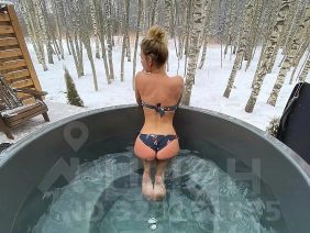 Изюминка комплекса - горячая купель, расположена на отдельной террасе, огороженной с трех сторон для защиты от посторонних глаз. Помимо купели на террасе расположены шкаф, где можно оставить одежду и обувь, два деревянных кресла и небольшой столик. С террасы открывается замечательный вид на лес!