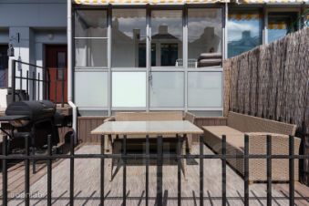 Первый этаж включает в себя просторную гостиную с действующим камином, домашним кинотеатром и лоджией с видом на сад, где установлен зимний вариант для барбекю, а также кухонную зону с лоджией и выходом на открытую террасу, разделяет стеклянная перегородка - стильное современное решение. На террасе установлена маркиза, которая спасет вас от дождя или яркого солнца.