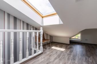 На втором этаже расположена мастер-спальня с ванной комнатой, смежная с помещением 10м2, которое можно использовать как гардеробную или под любые другие цели (детская, фитнес, организовать рабочее место), и детская комната с лоджией и ванной комнатой.