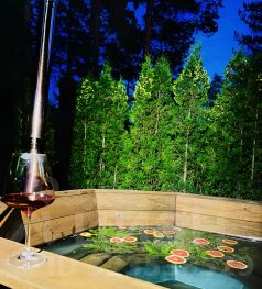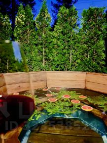 Так же на территории дома расположен уличный деревянный чан, который стал настоящим символом расслабления и уюта,позволяя наслаждаться купанием в любое время года — будь то прохладное осеннее утро или морозный зимний вечер. Вечером пространство вокруг чана освещается мягким светом гирлянд, создавая атмосферу уюта и волшебства. Это идеальное место для романтических вечеров, неспешных разговоров с друзьями или просто для того, чтобы побыть наедине с собой.