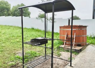 Мангальная зона под крышей; ворота с автоматикой; парковка до 6 машин; теплая купель офуро-фурако с подогревом на дровах.