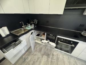 На кухне вместительный четырехкамерный холодильник, посудомойка, плита с духовкой, вытяжка, посуда