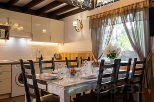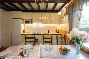 На кухне — 4-х конфорочная электроплита, двухкамерный холодильник, Свч, посудомоечная машина, стиральная машина, термопот, комплект посуды для приготовления пищи и комплект столовой посуды на 10 человек. Постельное белье и полотенца из натурального хлопка входят в стоимость проживания.