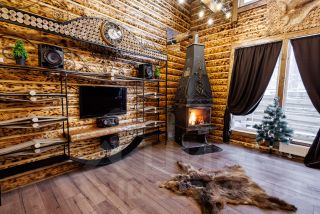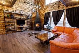 1 этаж разделен на 2 зоны (зона гостиной, кухня, зона столовой и большой холл) - гостиная с дровяным камином из природного камня, большим угловым диваном