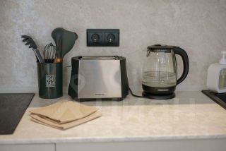- Кухня: индукционная плита, микроволновая печь, электрический чайник, тостер, холодильник с морозильной камерой, посудомоечная машина, таблетки для посудомоечной машины, моющие средства, посуда, капсульная кофемашина (капсулы приобретаются отдельно)