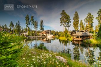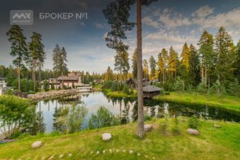 Дом общей площадью 460 квадратных метров располагается в тихой и отдаленной части поселка прямо на берегу живописного пруда с рыбками.