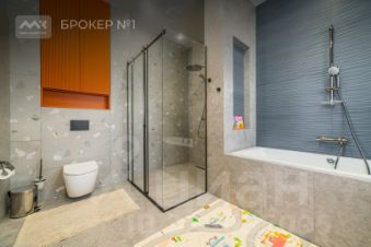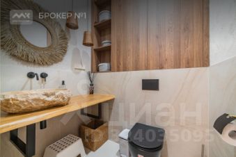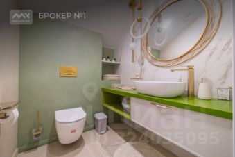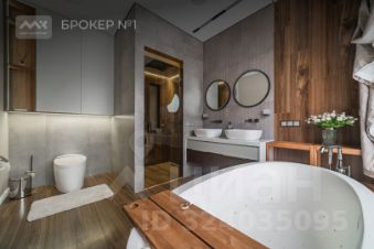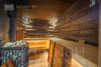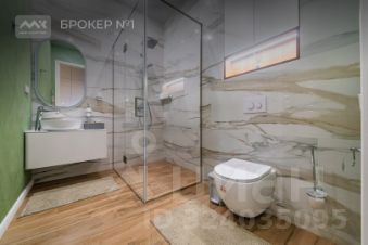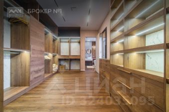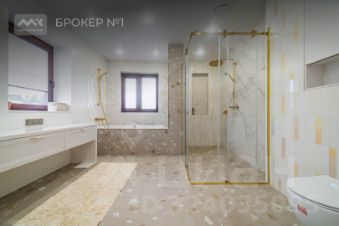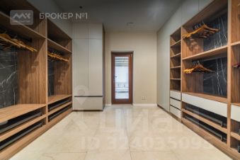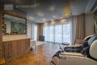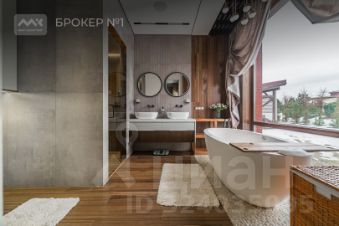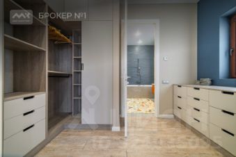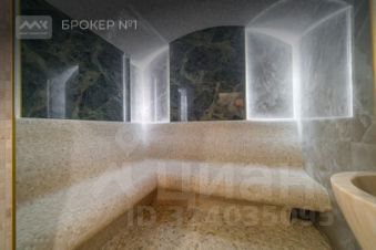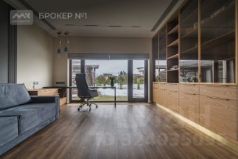 На первом этаже также расположилась мастер-спальня с рабочей зоной, огромной гардеробной, санузлом с панорамной ванной, гостевая комната со собственным санузлом и хаммамом, кабинет с раскладывающимся диваном, гостевой санузел, гардеробная для сезонной одежды и постирочная со всем необходимым инвентарём.