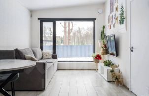Кухня-гостиная: панорамные окна, раскладной диван, ТВ с подпиской на Кинопоиск, настольные игры, колонка Алиса.