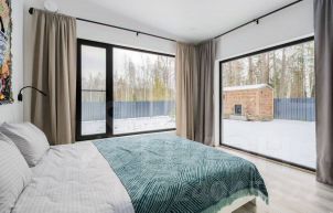 Спальня: двуспальная кровать, два панорамных окна с лесным видом, большой шкаф.