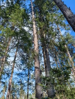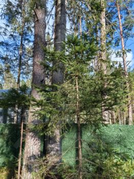 Участок огорожен забором с откатными воротами. Сохранены сосны, елочки, рябинки.