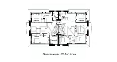 Первый этаж включает кухню-столовую, гостиную с камином и кабинет. На втором — мастер-сьют с гардеробной и ванной, детская спальня с игровой, отдельной ванной комнатой и хозяйственное помещение. На третьем — две детские спальни и большая игровая зона с кухней.