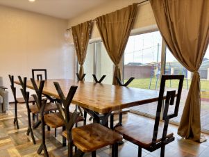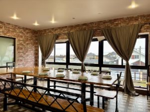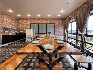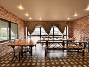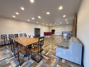 - столовая с зоной кухни, обеденными столами, печью и бытовой техникой, и посудой.