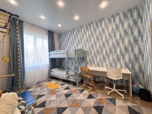 Детская комната, где есть всё для маленьких гостей: двухъярусная кровать, спортивный комплекс и письменный стол.
