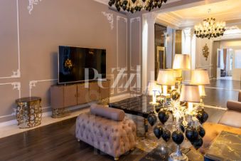 Войдя во владение, вы попадаете в прихожую круглой формы ротонду, далее следует холл с кессонированными потолками и дизайнерским декором, он плавно направляет вас в уютную современную итальянскую кухню-гостиную, расположенную на первом этаже. Также на первом этаже расположены: гостевая комната, санузел, гардеробная и прачечная.