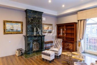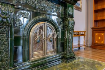 Напротив мастер-спальни находится просторный кабинет в классическим стиле с действующим антикварным камином и керамическими изразцами.