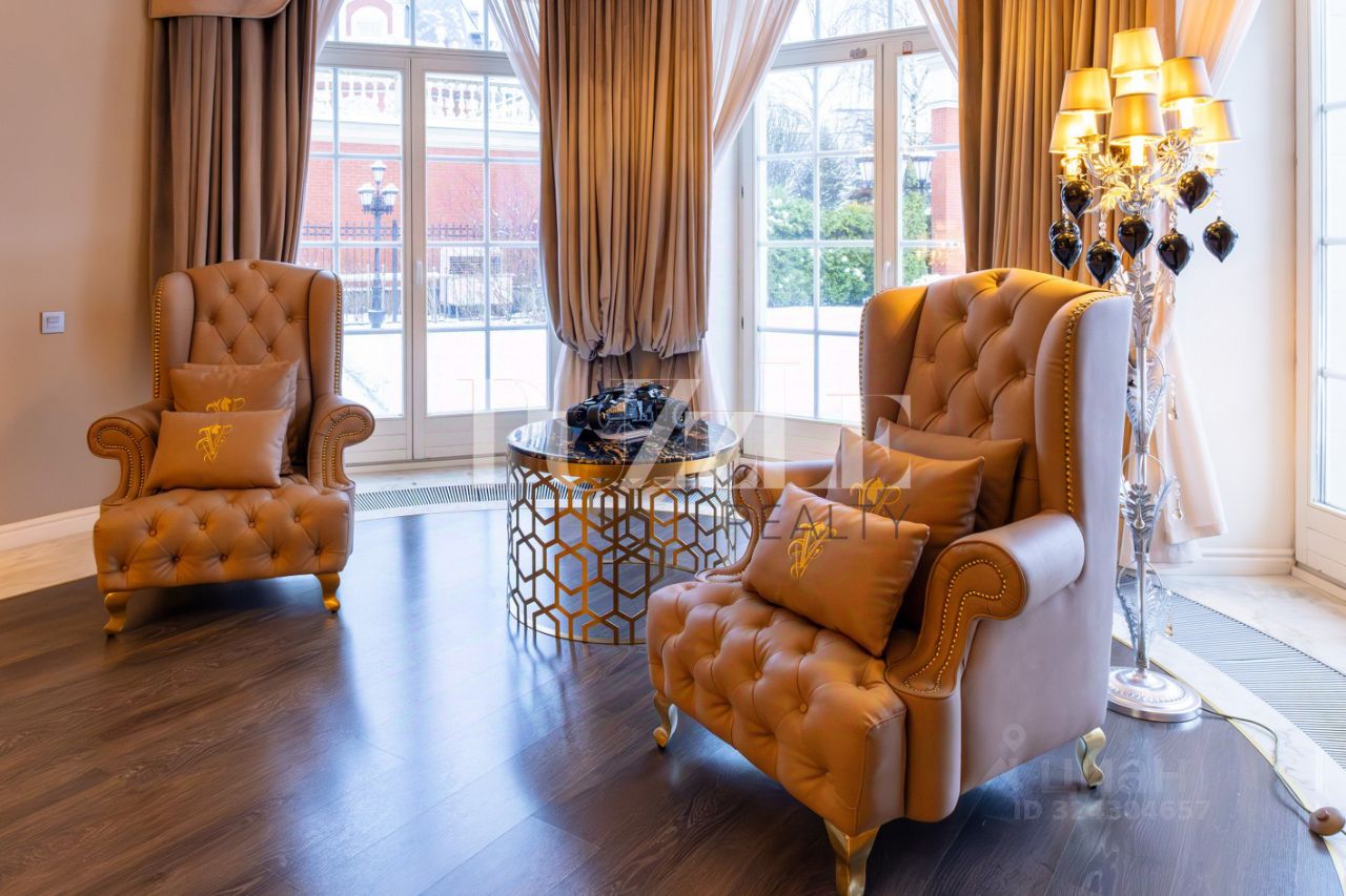 Внутренняя отделка выполнена из натуральных материалов - камень различных пород, ценные породы дерева, оригинальная лепнина, дизайнерская мебель по индивидуальном заказу.