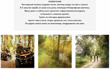 Зимой, когда в городе снег очень быстро тает, возвращаясь в коттеджный поселок можно увидеть зимнюю сказку. Лес, окружающий поселок и создающий обособленность и уединение, покрывается шапкой снега. В шаговой доступности от дома всего в 5ти минутах пролегает река, питающая Петергофские фонтаны.