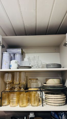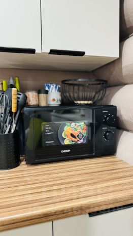 Кухня: Всё для готовки — плита, микроволновка, чайник, набор посуды, кастрюли и сковородки.