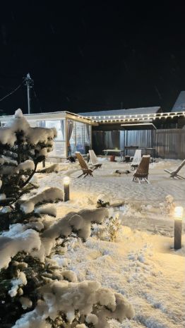 Беседка для согревающих историй, с мягким диваном и креслами.