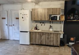 Далее Вместительная Гостиная -кухня 6 на 4 с камином , есть диван, стол и стулья.