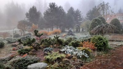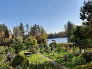 Участок большой, с перепадами высот и дизайнерским ландшафтом. Много зелени: хвойники, цветы и небольшая сосновая роща. Есть огород.