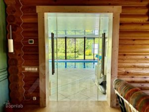 - Первый этаж: гостиная с камином, кухня-столовая, спальня, SPA-зона (бассейн с витражными окнами, сауна, душевая), санузел