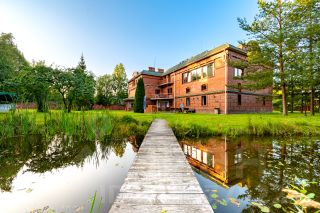 Вокруг дома парк с дорожками, скамейками и прудом, есть площадки для парковки 8 а/м , оборудована зона барбекю для приготовления шашлыка с мангалом. От шоссе до коттеджа асфальтированный подъезд.